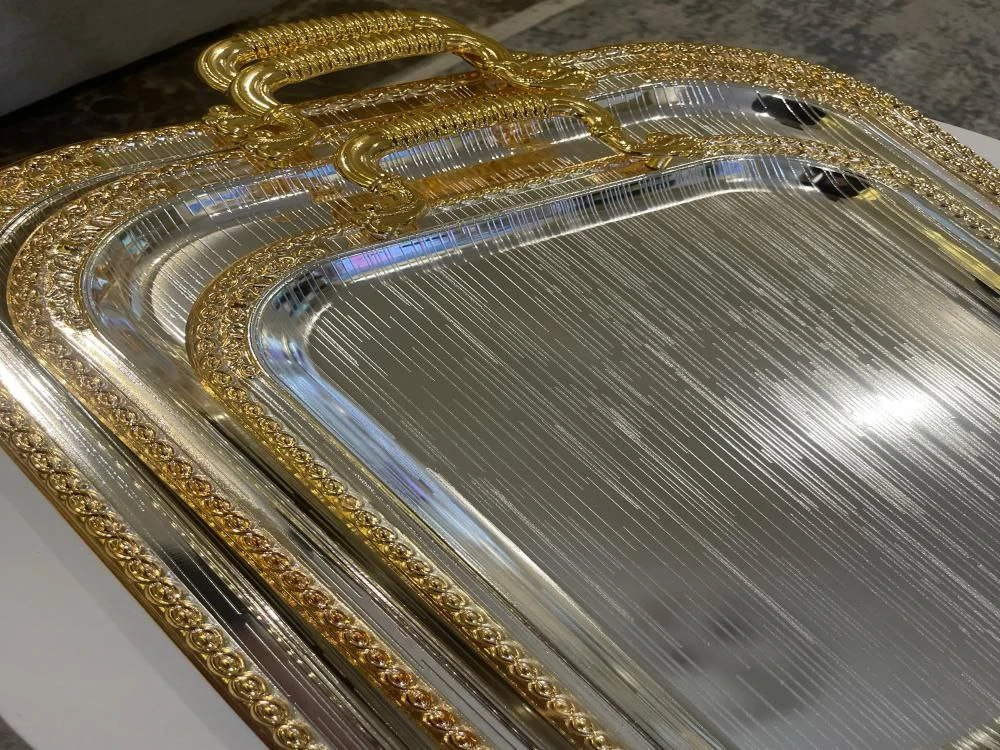 صحن تقديم ستيل فضي حواف ذهبي مستطيل راقي HK-2937