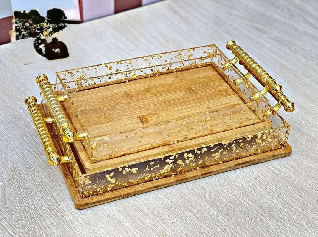 صحن تقديم خشبي مستطيل اطار اكرليك مذهب بيدين ذهبي9653