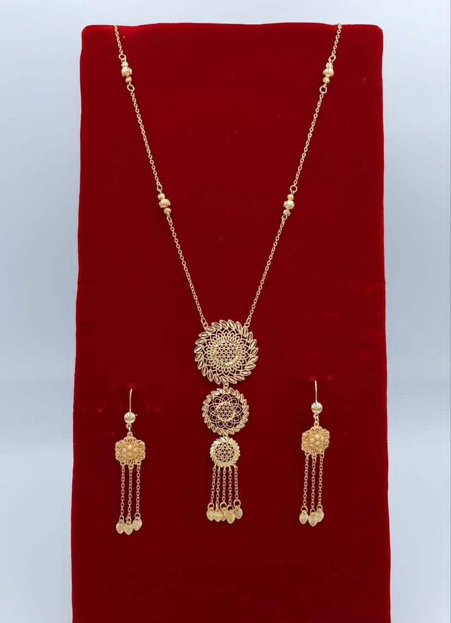 طقم ذهبي (قلادة وأقراط) بقلادة متدلية بثلاثة أشكال زهرية مفرغة متدرجة وشراشيب ذه