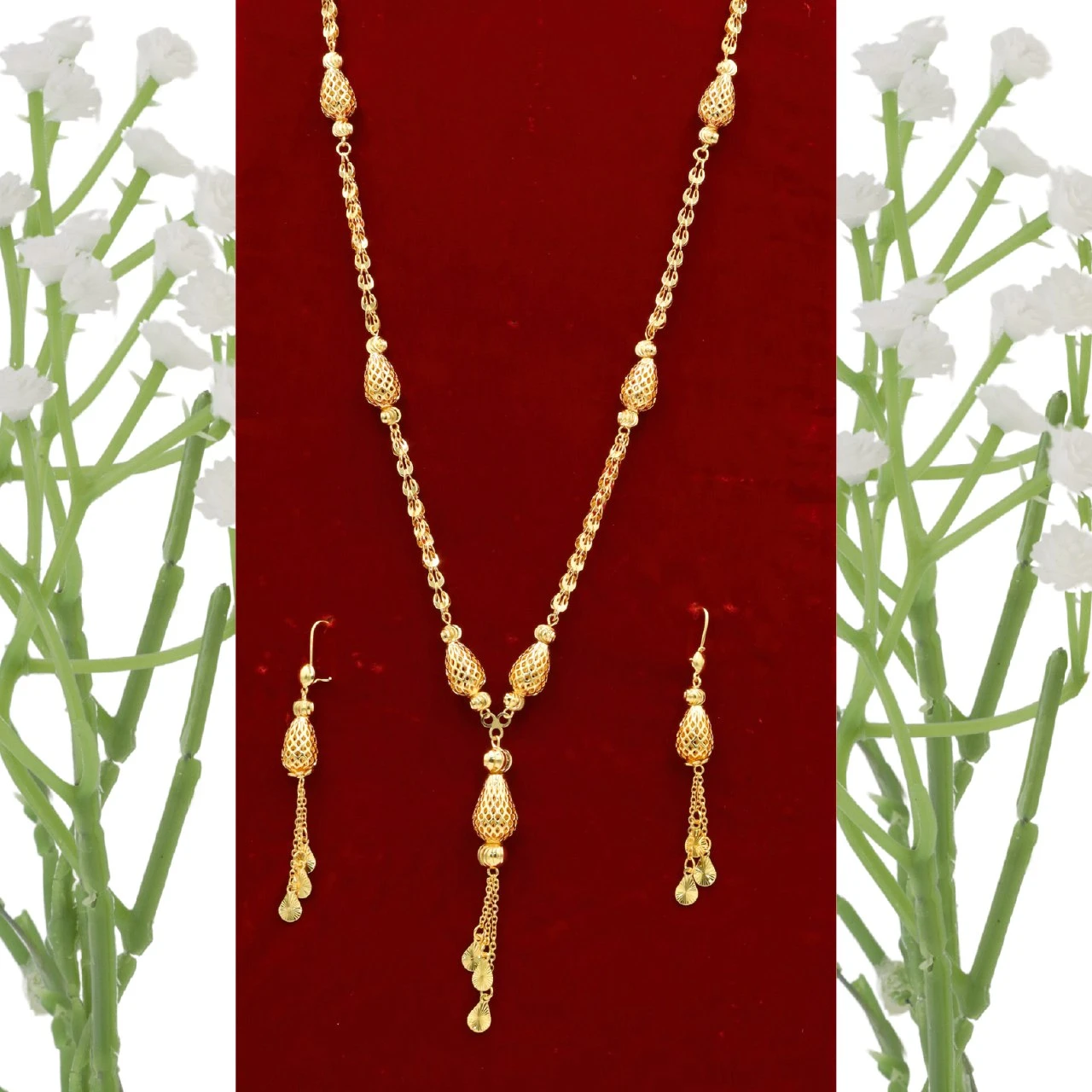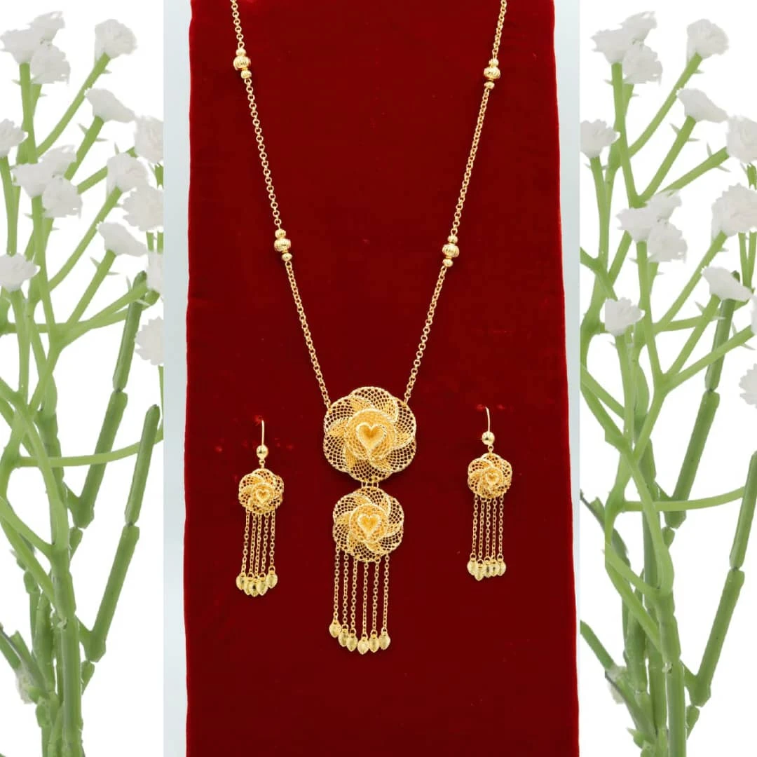طقم ذهبي (قلادة وأقراط) بقلادة متدلية بتصميم زهرتين مفرغتين متصلتين وشراشيب ذهبي