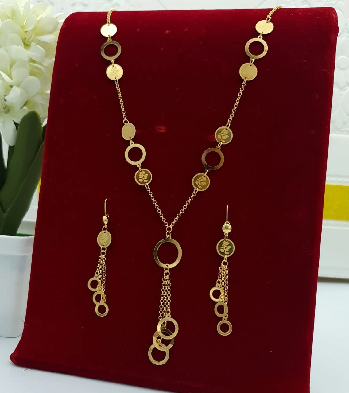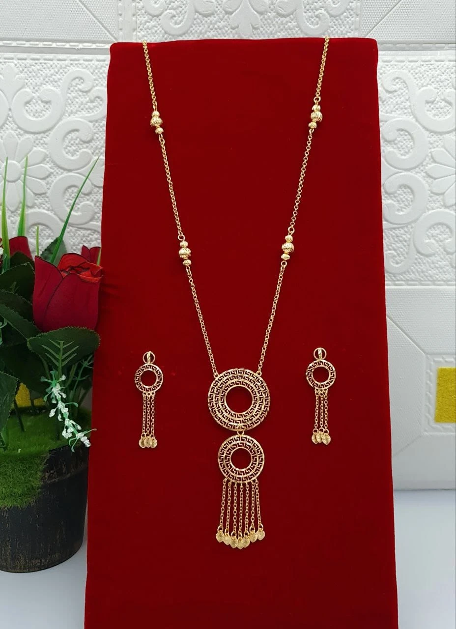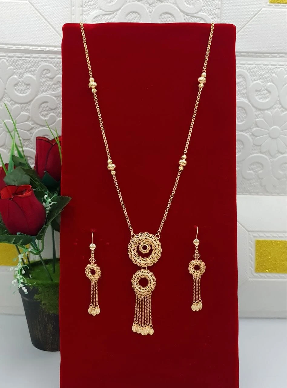 طقم ذهبي (قلادة وأقراط) بقلادة متدلية بحلقتين دائرية مفرغة متصلة وشراشيب ذهبية و