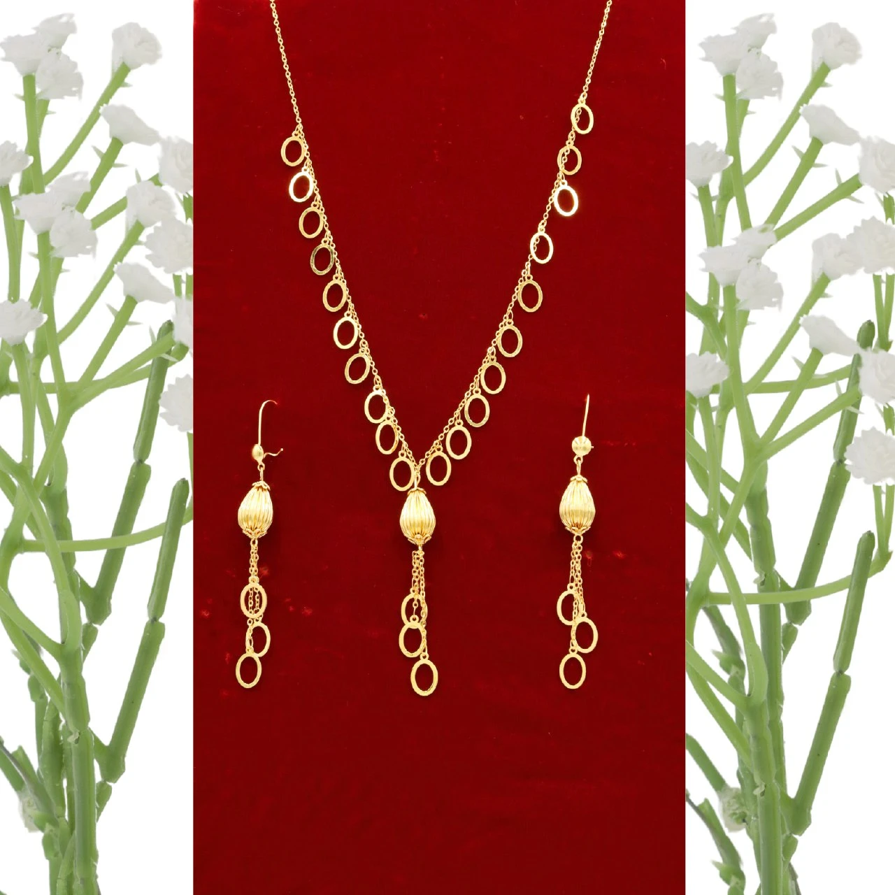 طقم ذهبي (قلادة وأقراط) بقلادة متدلية بثلاثة أشكال زهرة البرسيم متصلة وشراشيب ذه