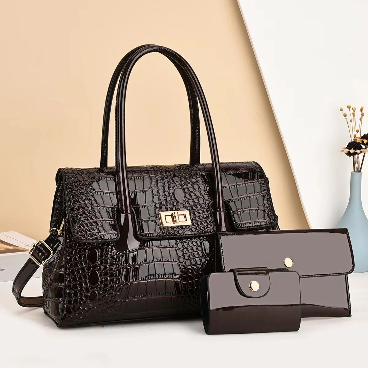 حقيبه يد نسائي دفء الشوكولاتة (3 قطع) لون : بني لامع من حقائب كلاسيك